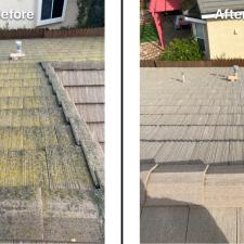 The first step was to remove all of the green, yellow, and black organic growth with a low pressure cleaning. This step removes all of the topical growth that makes the roof ugly and slippery. Next, we apply our special postwash solutions that works on the organic growth beneath the surface of the roof tile. This solutions kills the roof of that Algae so that the roof will not just look clean, but stay clean for years to come. Finally, we clean out all of the gutters and clean up any overspray. If you are interested in restoring your roof to what it once looked like give us a call!